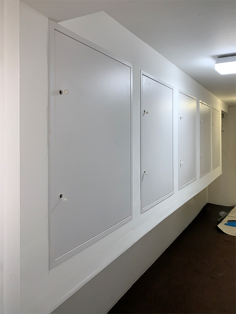 The photos show re constructions of services using Gyproc fire-line plasterboard, with fire and smoke resistant access hatches installed to ensure full access is still available to the services enclosed.